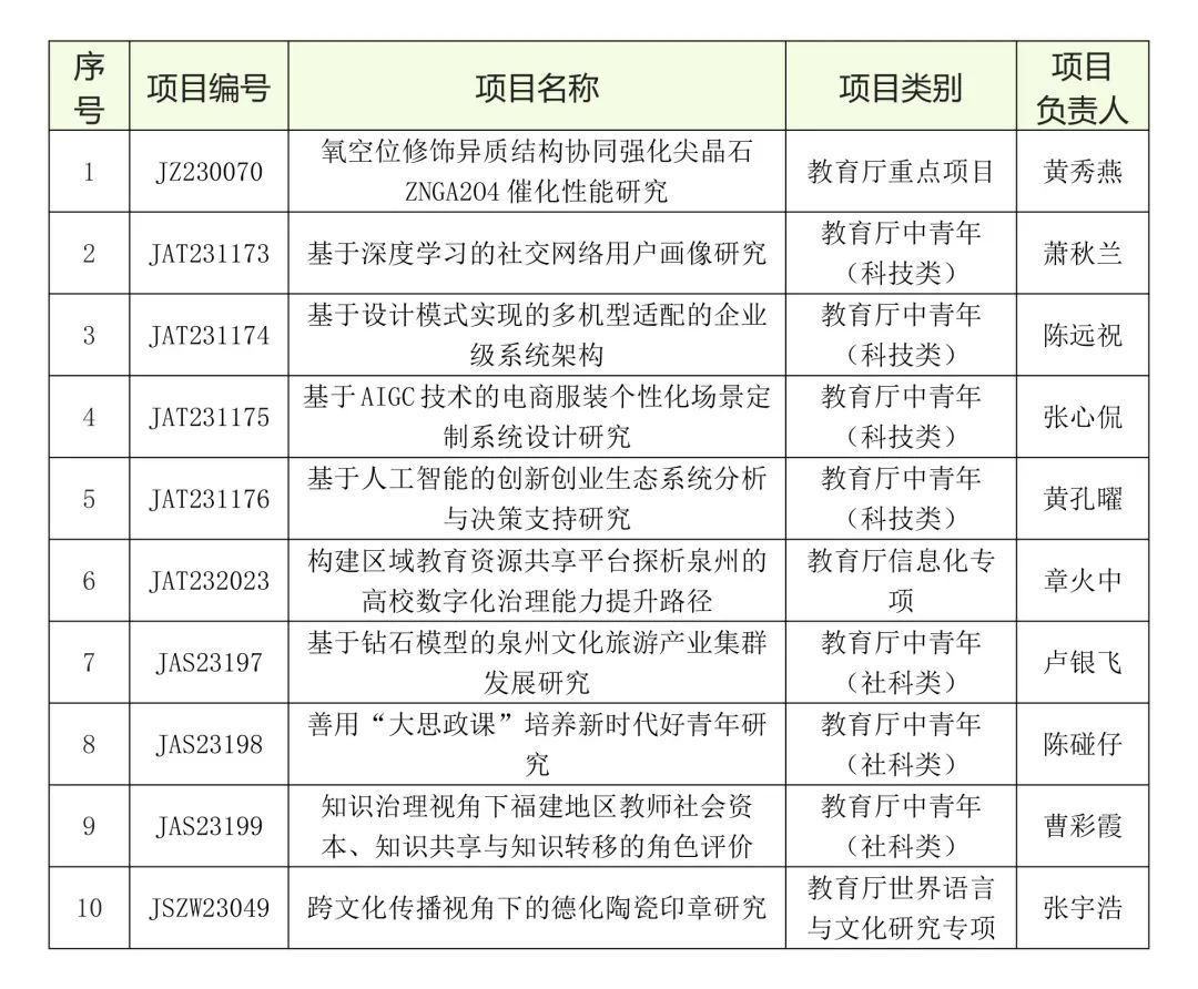 近日,福建省教育厅公布了2023年度福建省教育系统哲学社会科学研究有关项目立项名单、2023年度福建省中青年教师教育科研项目(科技类)立项名单,九体育在线平台共有10项课题获批立项。