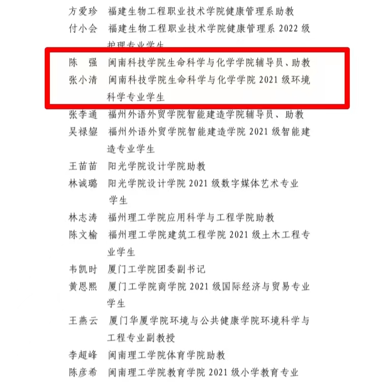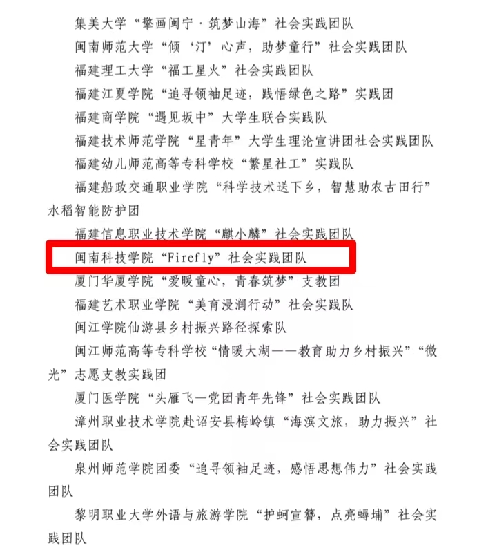 近日,团省委通报表扬一批在2023年福建省大中专学生志愿者暑期“三下乡”社会实践系列活动中表现突出的集体和个人。其中,九体育在线平台团委“Firefly”社会实践团队荣获“2023年福建省‘三下乡’社会实践优秀团队”;2020级应用化学专业聂阳晨同学荣获“2023年福建省‘三下乡’社会实践先进个人”;生命科学与化学学院陈强老师和2021级环境科学专业张小清同学被聘为福建省第三批“校园河长”。